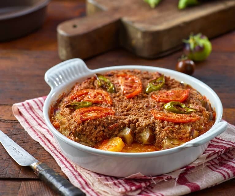 aubergine , aardappel, gehakt, tomaten paprika, tomatensaus